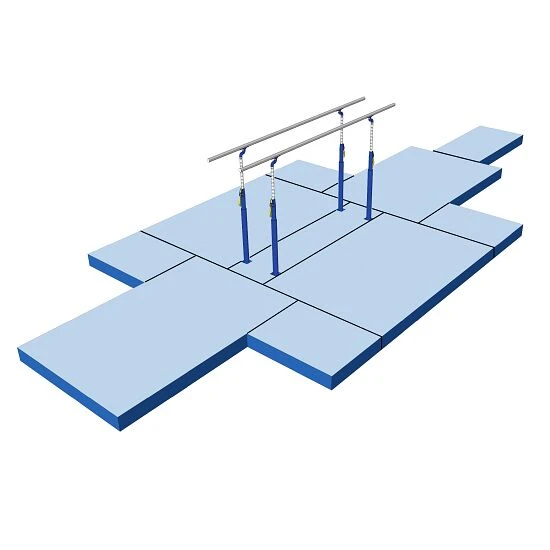 Der Bänfer Fallschutz-Mattensatz für Turnbarren „Exklusiv“ besteht aus 10 Matten. Die Oberfläche der Niedersprungmatten ist fest mit dem Mattenkern verklebt, sodass keine Wellen oder Falten im Nadelfilz entstehen. Der Mattenkern wird durch eine zusätzliche Randverstärkung gestützt und gibt der kompletten Matte mehr Stabilität. Die einzelnen Matten haben auf der Oberseite ein 10 cm breites Flauschband und lassen sich mittels 20 cm breiten Klettbandlaschen schnell und einfach miteinander verbinden. Es entsteht eine Fallschutz-Fläche von 34 m².