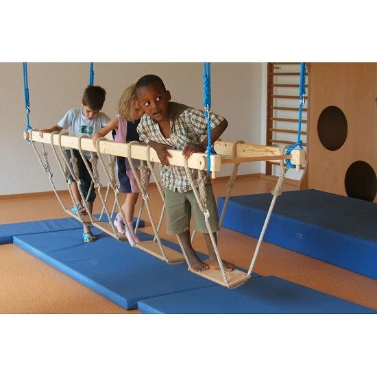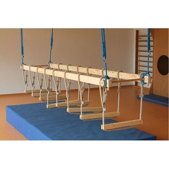Bei dem Dschungelbarren können Sie die Herausforderung für die Kinder durch vier Aufbauvarianten steigern: Sie können den Dschungelbarren mittels einer 2-Punkt- oder einer 4-Punkt- Aufhängung an der Deckenbefestigung anbringen. Bei der 4-Punkt-Aufhängung ist das Schwingungsverhalten ruhiger, während es bei der 2-Punkt-Aufhängung dynamischer und somit eine größere Herausforderung ist. Zudem haben Sie Wahl zwischen dem durchgängigen Balken als Trittfläche oder 4 Trittbretter, die jeweils von 2 Seilen gehalten werden. Die Trittplatten haben an den Seiten je 2 Einbuchtungen, in denen die Seile sicher geführt werden.