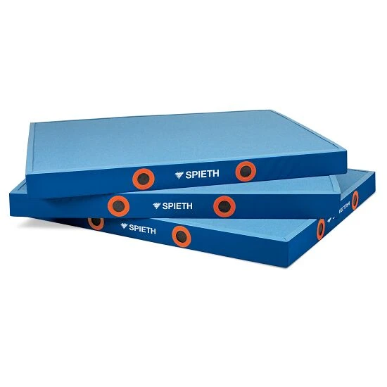 Die Spieth Niedersprungmatte „Moskau“ kommt in Sandwichbauweise mit unterschiedlicher Schaumhärte sowie zusätzlicher Randstabilisierung. Der Oberbelag besteht aus strapazierfähigem NadelvliesEin Faserflor aus einer oder mehreren Lagen von Stapel-Fasern, verfestigt mit Nadeln (z.B. Kronennadeln). Wird als Oberfläche fest mit einem Kern verklebt, daher keine Faltenbildung. Eigenschaften: Hautsympathisch, trittsicher, fügt keine Verbrennungen zu. Verwendung: Bodenbelag, Kfz-Innenraum, Oberfläche auf Niedersprungmatten.-Velours, der Bezug aus gewebeverstärktem PVC-Stoff. Zudem bietet die Matte eine rutschfeste Unterseite mit zusätzlichen Entlüftungsausschnitten, die sich gleichzeitig als Tragegriffe nutzen lassen. Hervorzuheben ist hier, dass die Tragegriffe 6-mal höhere Reißfestigkeit aufweisen. Die runden Aussparungen dienen außerdem einer idealen Luftzirkulation innerhalb der Matte – somit erhalten Sie nicht nur eine Matte für sichere Abgänge und Landungen, sondern profitieren obendrein von einer langen Nutzungsdauer. Klettflauschverbindungen an jeder Ecke sorgen für eine lückenlose sowie sichere Verbindung von mehreren Matten.
