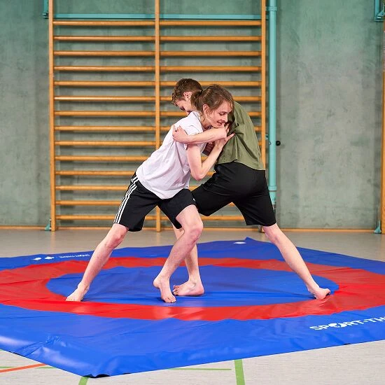 Die Sport-Thieme Bodenturnfläche „Ringen & Raufen“ by Foeldeak eignet sich u. a. für kleine Kampfsportler, die sich hiermit spielerisch an das Thema Raufen und letztendlich Ringen heranführen lassen. Aber auch als Ringerfläche, dank des offiziellen Designs, sowie für zahlreiche weitere Sportarten lässt sich die Mattenfläche einsetzen. Möglich macht das die besondere Bauweise. So befinden sich unter der Plane 2 bzw. bei der größeren Ausführung 3 Bodenturnläufer. Die Kombination aus Rollbahnen und Mattendecke bzw. -plane sorgt für zahlreiche Einsatzmöglichkeiten. Denn im Schulsport lassen sich die Bodenturnläufer ohne Mattendecke zum Turnen nutzen. Zum Ringen und Raufen sollte die Plane zum Einsatz kommen, um „Mattenbrand“ bei Kampfsport-Übungen zu verhindern.