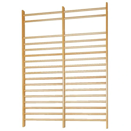 Die 1. und 3. Sprosse von oben sind vorgelagert. Dies ist ideal zur Entlastung der Wirbelsäule und für Eigengewichts-Übungen. In Kombination mit unseren Klimmzugbügeln bildet unsere Doppelfeld-Sprossenwand das ideale Trainingsgerät für Klimmzug, Dehn- und Streckübungen.