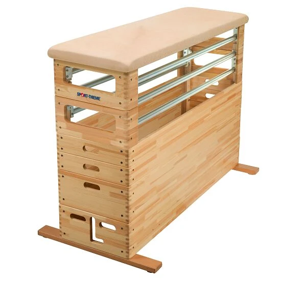 Der Sport-Thieme Kombi-Turnbaukasten „Mario“ besteht aus massivem, allerbesten Nadelholz und einem hochwertigen Bezug aus Kernrindleder. In der eigenen Fertigung perfekt verarbeitet und mit höchster Maßgenauigkeit von ±0,5 mm. Ein ausgeklügeltes System bietet große Formstabilität: Alle Teile der Sprungkästen sind innen zusätzlich mit doppelt verschraubten MultiplexMultiplex-Platten sind Furnier-Sperrholzplatten aus mindestens 5 Furnierlagen gleicher Dicke. Die Lagen sind quer zueinander verleimt, d.h. die Richtung ihrer Maserung ist von Schicht zu Schicht um 90° gedreht. Dadurch sind die Platten extrem formstabil und halten sehr hohen Belastungen stand. Verwendung: z. B. Sprungkästen, Theken, Bühnenbau, Werkbänke, Treppenbau-Führungsleisten ausgestattet. Die rutschsicheren Standfüße aus Hartholz mit nicht färbenden Gummipuffern sorgen für einen festen Stand. Für den kinderleichten Transport des großen Kastens empfehlen wir Ihnen den Einbau passender Schwenkrollen. Die erforderlichen Öffnungen sind bei allen Kästen bereits serienmäßig vorhanden.