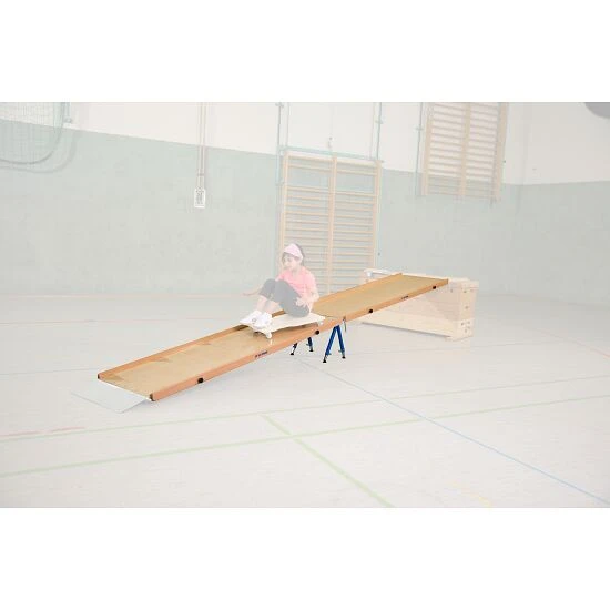 Mit dem Sport-Thieme Schiefe Ebene Sprungkastenset 2 kann eine bereits vorhandene schiefe Ebene beidseitig auf 120 cm Breite bzw. 416 cm Länge ausgebaut werden. Es können fast alle Rollbretter benutzt werden. Mithilfe der zum Lieferumfang gehörenden Scharnierstifte werden die Ebenen verbunden oder am Startplateau befestigt. Zur Verlängerung der Ebenen werden zwei höhenverstellbare Untersetzböcke aus einer stabilen Stahlrohrkonstruktion genutzt. Ein absatzfreier Übergang und ein Fußbodenschoner an den Untersetzböcken schonen den Hallenboden. Ohne großen Aufwand und Werkzeuge können Sie die Bahnen seitlich verbinden, sodass Sie eine Breite von 120 cm haben.