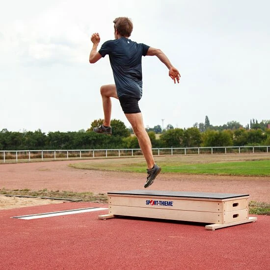 Der Sport-Thieme Sprungkrafttrainer „Jump“ ist mit seiner großen Sprungfläche ein Allrounder für jedes Sprung-Training. Verlängern Sie die Flugphase durch einen erhöhten Absprung und setzen Sie ihn im Weitsprung- und Dreisprung-Training ein. Er eignet sich beispielsweise ideal für das Technik-Training des zweiten Absprungs (Step) im Dreisprung. Nutzen Sie ihn auch zur Steigerung von Explosivität, Schnellkraft und Maximalkraft der Athleten.