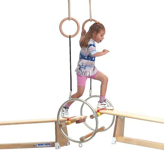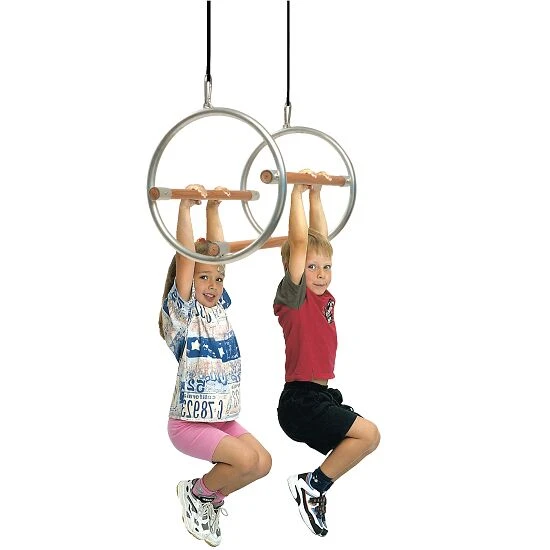 Ziehen Sie die Isilink-Leinen durch die Ringe und befestigen Sie diese mit den Karabinerhaken am Tripez. So schonen Sie die Holzturnringe. Eine direkte Befestigung mit großen Karabinerhaken an den Ringen empfehlen wir nicht, da das Metall Kerben und Riefen im Holz hinterlässt.