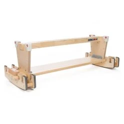 Die Turnbankwippe von Sport-Thieme lässt sich fest zwischen 2 Sprungkästen mit Vario-Öffnungen einhängen. Anschließend wird eine Turnbank nach DINDIN-Norm: Ein vom Deutschen Institut für Normung erarbeiteter freiwilliger Standard, in dem materielle und immaterielle Gegenstände vereinheitlicht sind. mit Mittelfuß in die Greifer eingehängt und von unten mittels Gurtband gesichert. Die Lieferung erfolgt ohne Sprungkästen und ohne Turnbank.